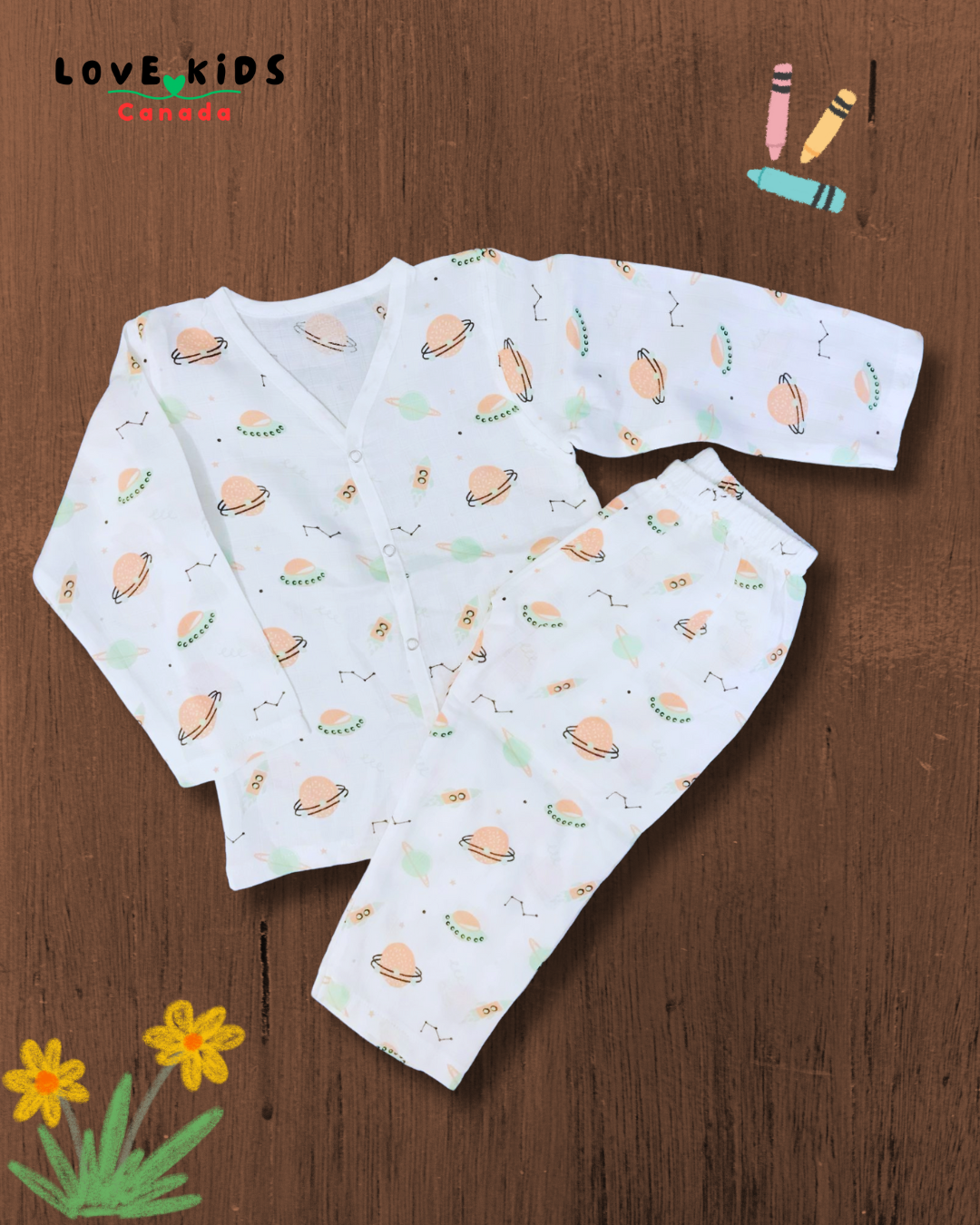 The matching pants offer a cozy fit with an elastic waistband for easy dressing and movement. Ideal for any season, this set is soft, hypoallergenic, and eco-friendly, making it a must-have for your little one's wardrobe.