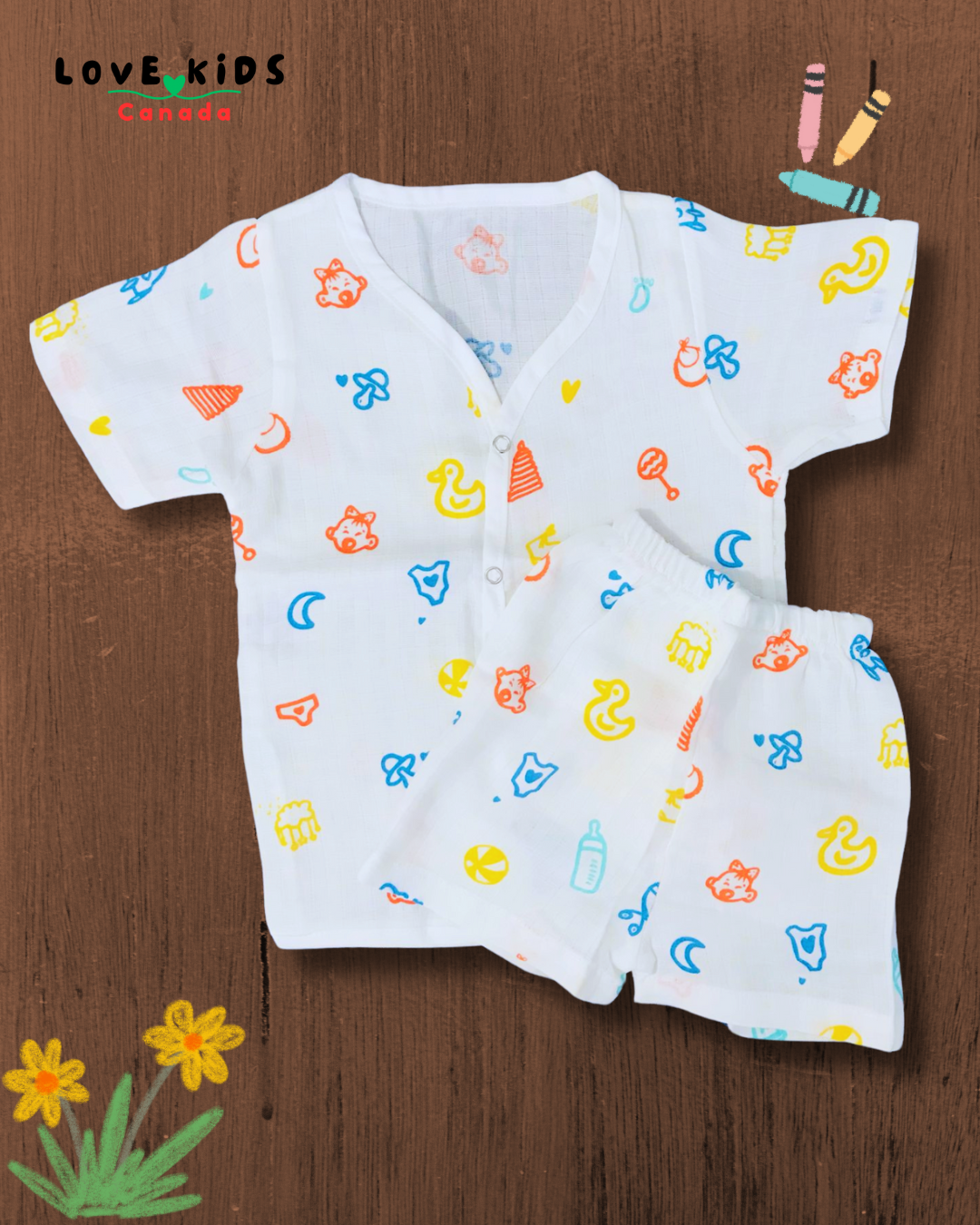 The matching shorts offer a cozy fit with an elastic waistband for easy dressing and movement. Ideal for any season, this set is soft, hypoallergenic, and eco-friendly, making it a must-have for your little one's wardrobe.